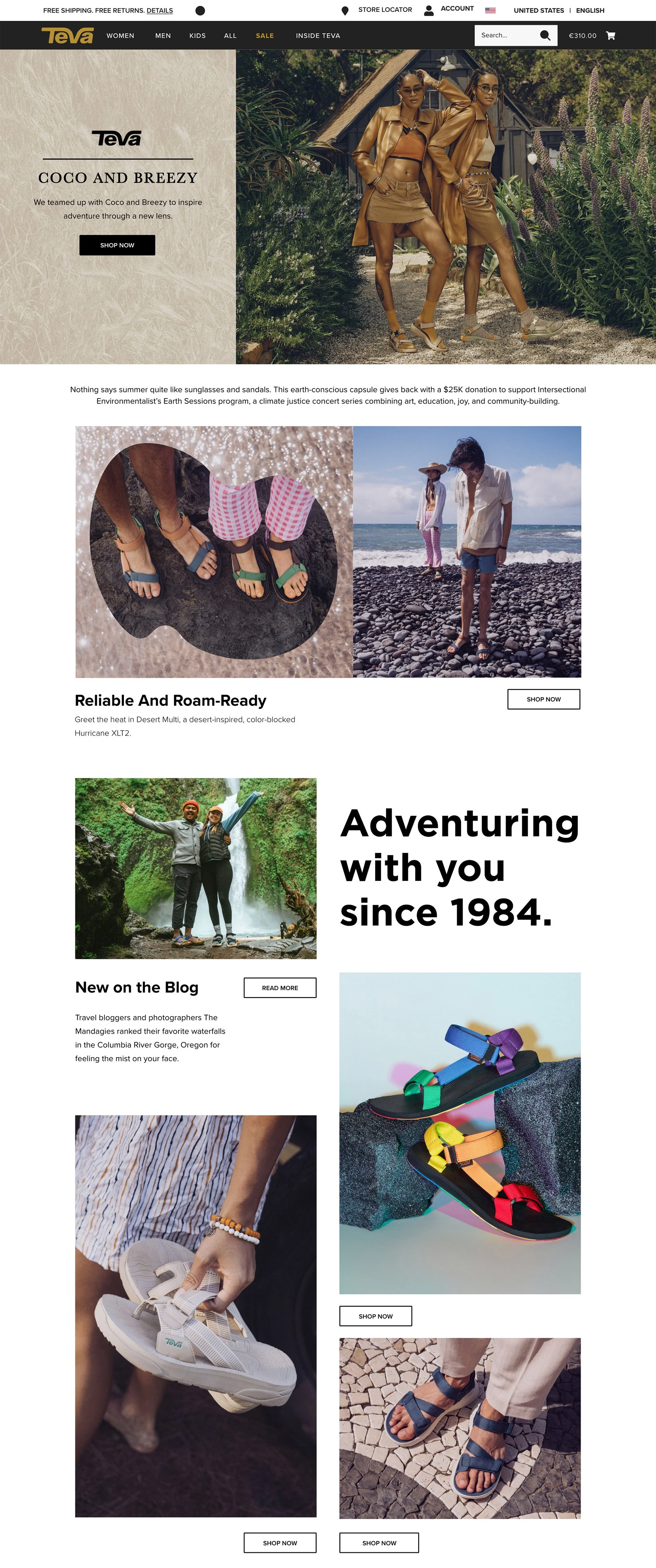 For this project I collaborated with Coco + Breezy in bridging the gap between a love for fashion and an alternative look into outdoor lifestyle. During the concept phase, I submitted moodboards for overall look and feel in terms of wardrobe, natural colors, and possible locations for shoot day. On set, i worked with our producer to allocate time slots to shoot at various sets at the location’s site while equally highlighting 2 different product offerings with 4 product variants. Post production, I lead the art direction and managed editing notes with the photographer, as well as leading the design direction for Teva.com’s web launch upon product release.